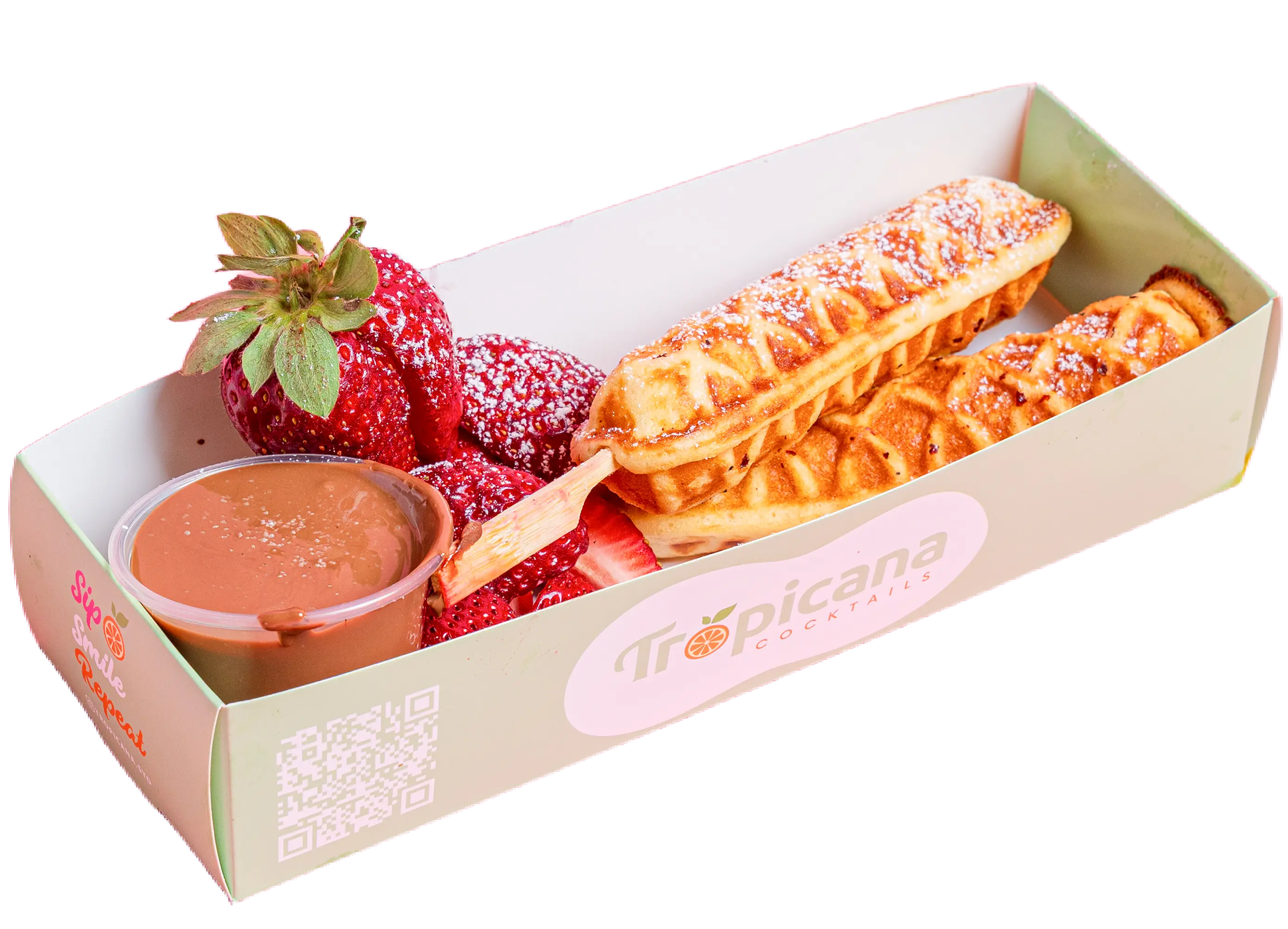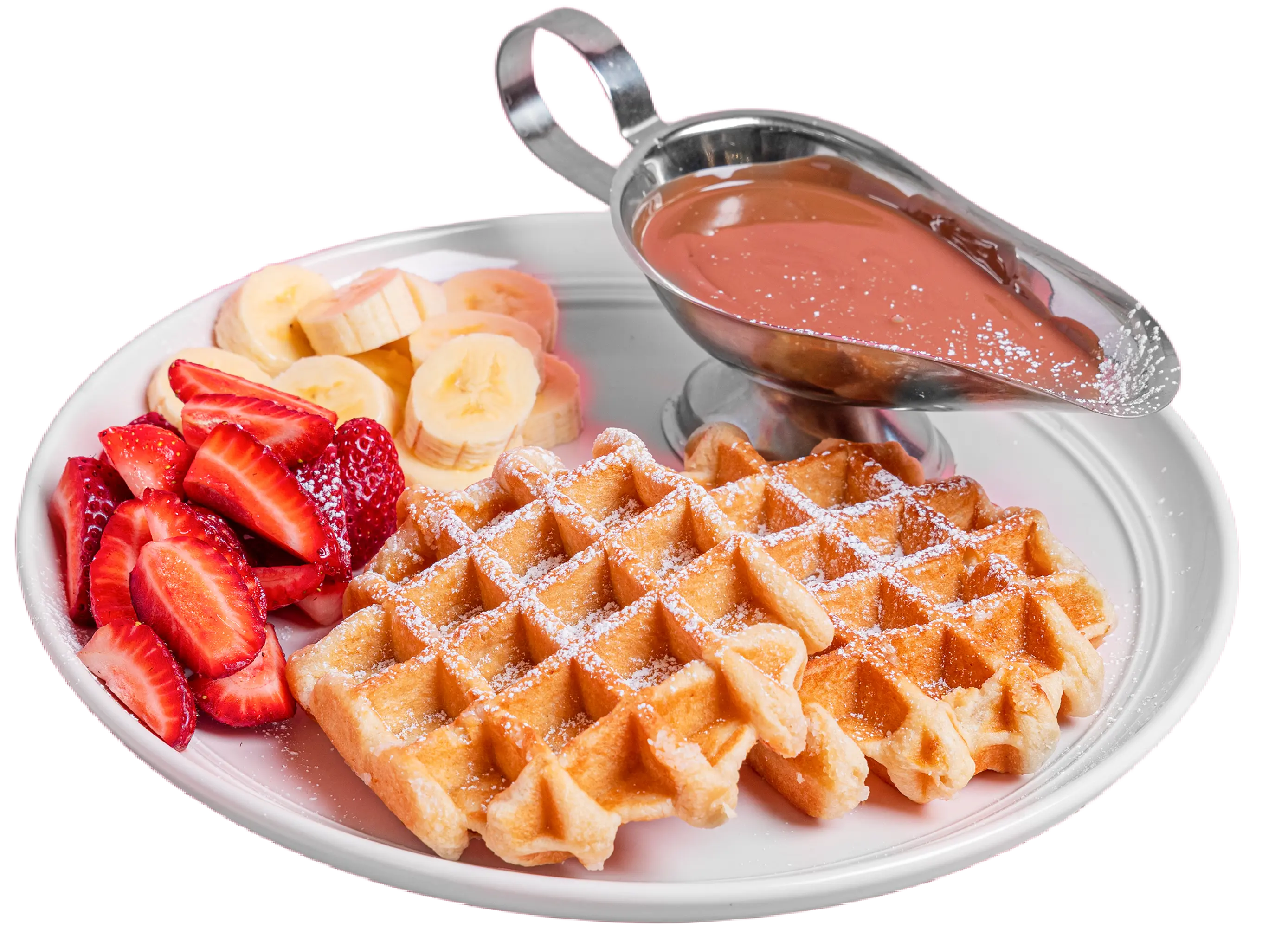 Crispy waffle sticks drizzled with rich Belgian chocolate and topped with fresh strawberries and banana slices.