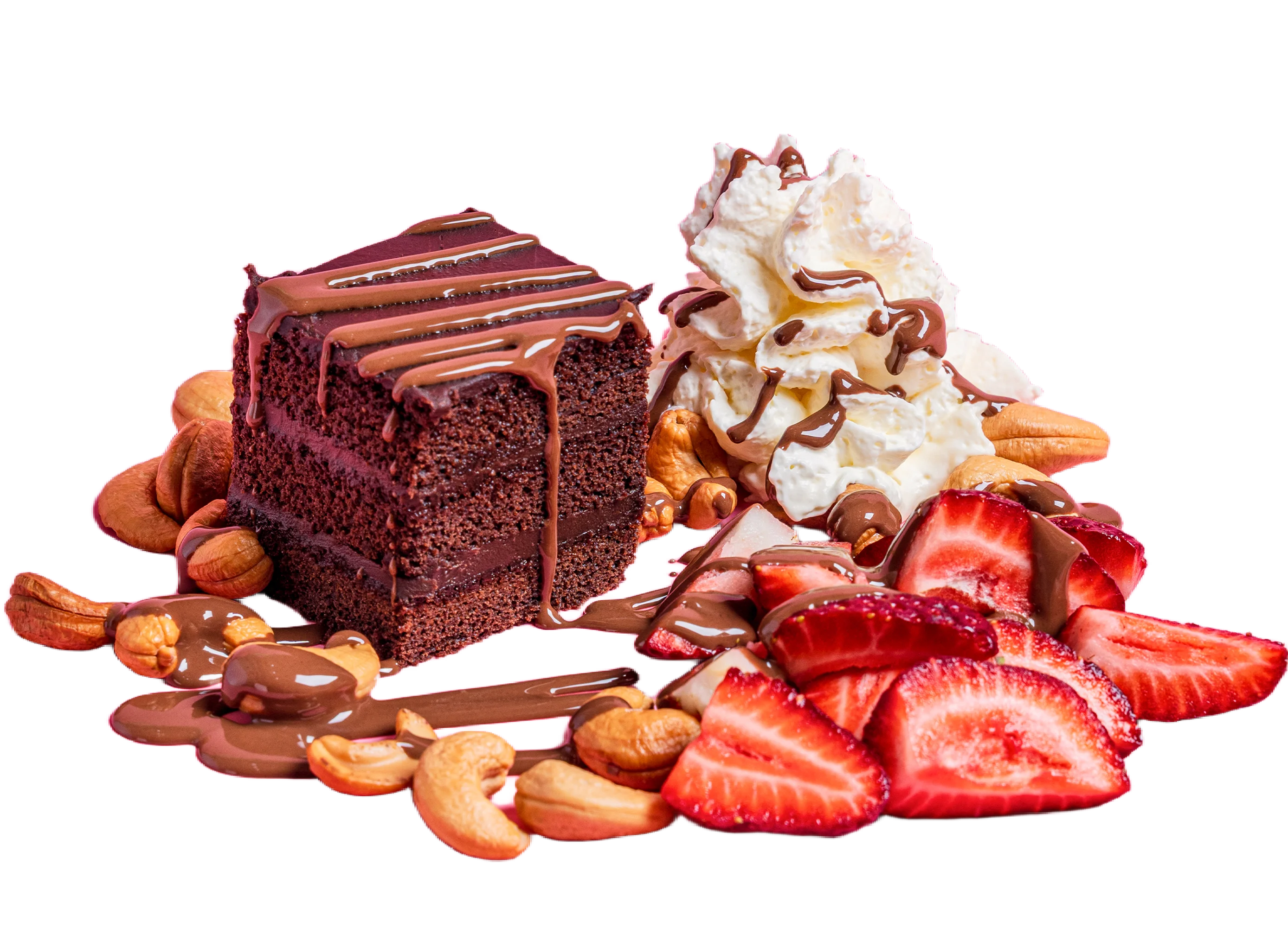 Fudgy brownie with whipped cream, fresh strawberries, nuts, and a generous drizzle of chocolate sauce.