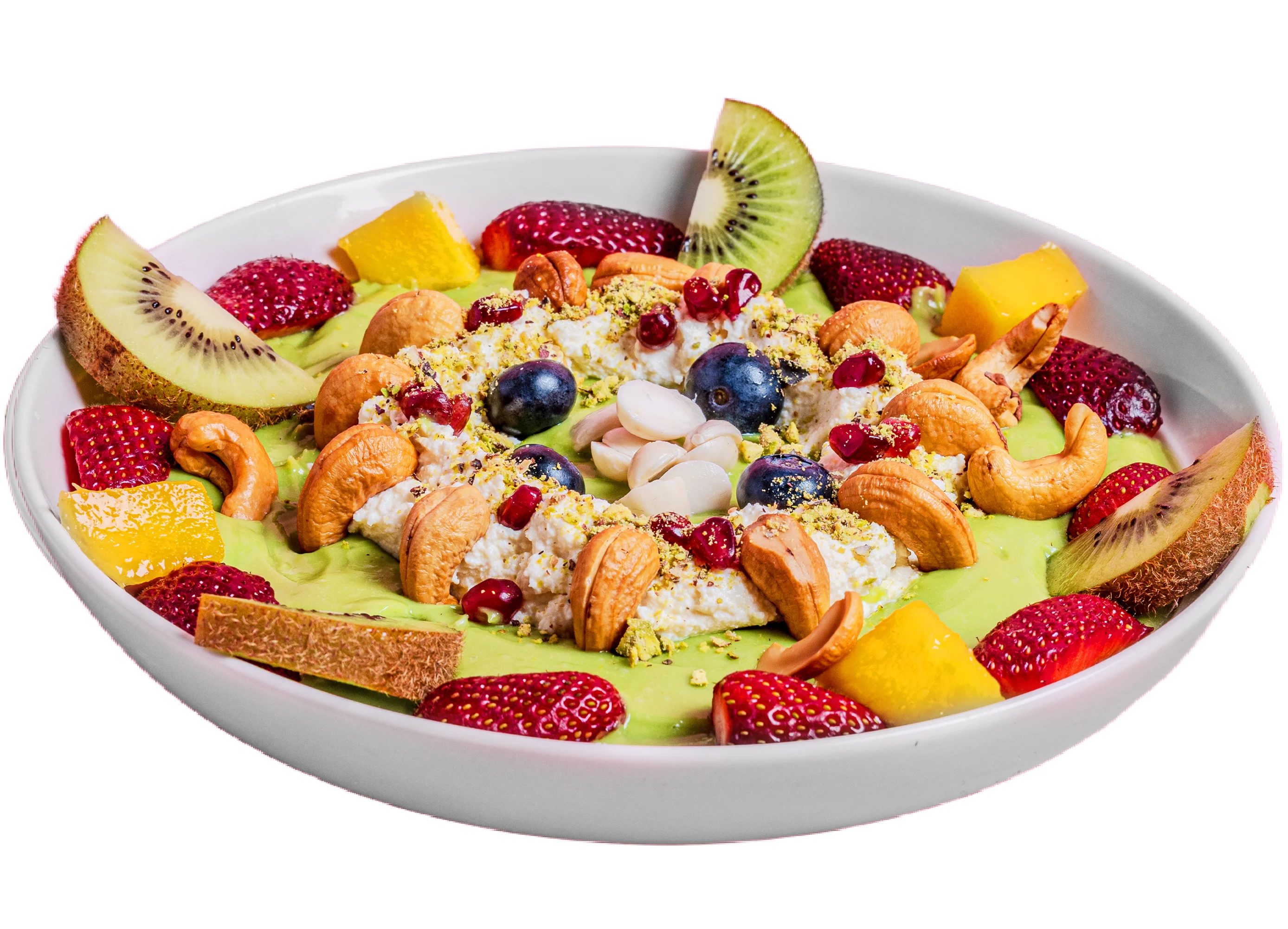 Our thick avocado base topped with ashta, cashew nuts, honey, and fresh fruit pieces.